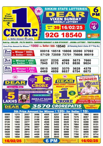 Dear vixen sunday weekly lottery 6 pm result 16-2-25