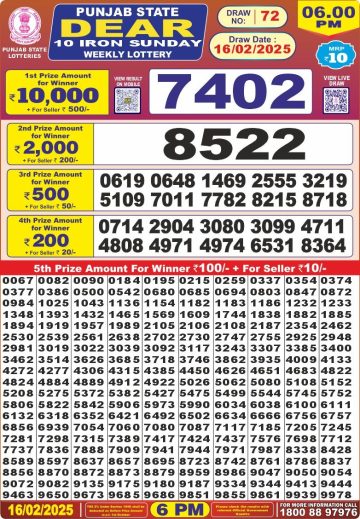 Punjab state dear 10 iron sunday weekly lottery 6 pm result 16-2-25