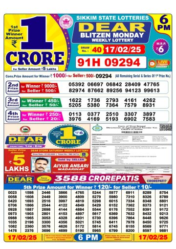 Dear blitzen monday weekly lottery 6 pm result 17-2-25