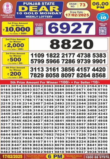 Punjab state dear 10 gold monday weekly lottery 6 pm result 17-2-25