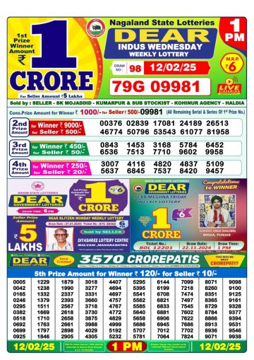 Dear indus wednesday weekly lottery 1 pm result 12-2-25