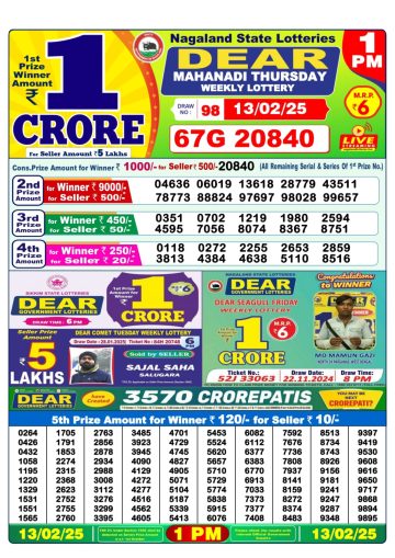 Dear mahanadi thursday weekly lottery 1 pm result 13-2-25