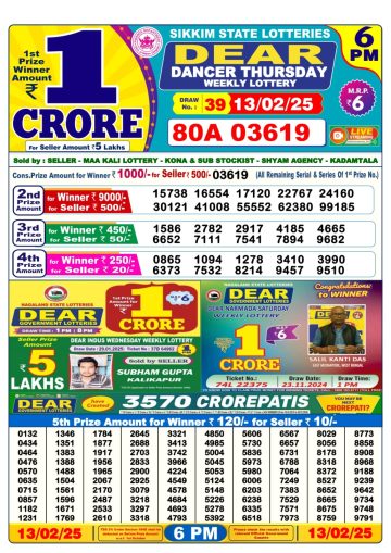 Dear dancer Thursday weekly lottery 6 pm result 13-2-25