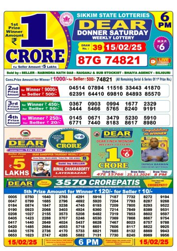 Dear donner Saturday weekly lottery 6 pm result 15-2-25