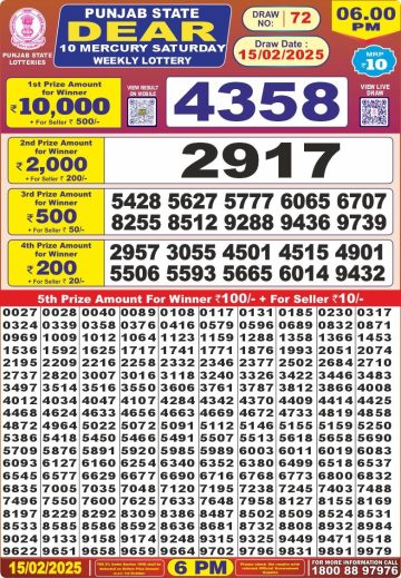 Punjab state dear 10 mercury Saturday weekly lottery 15-2-25