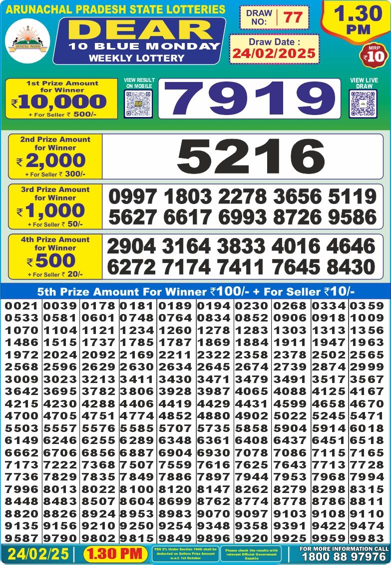 Dear 10 blue monday weekly lottery 1:30 pm result 24-2-25