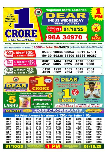 Dear Indus Wednesday Weekly Lottery 1 PM Result 01-10-25