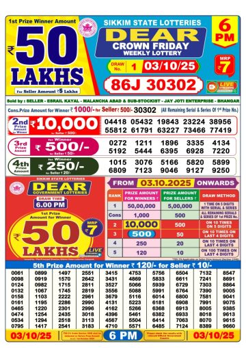 Dear Crown Friday Weekly Lottery 6 PM Result 03-10-25
