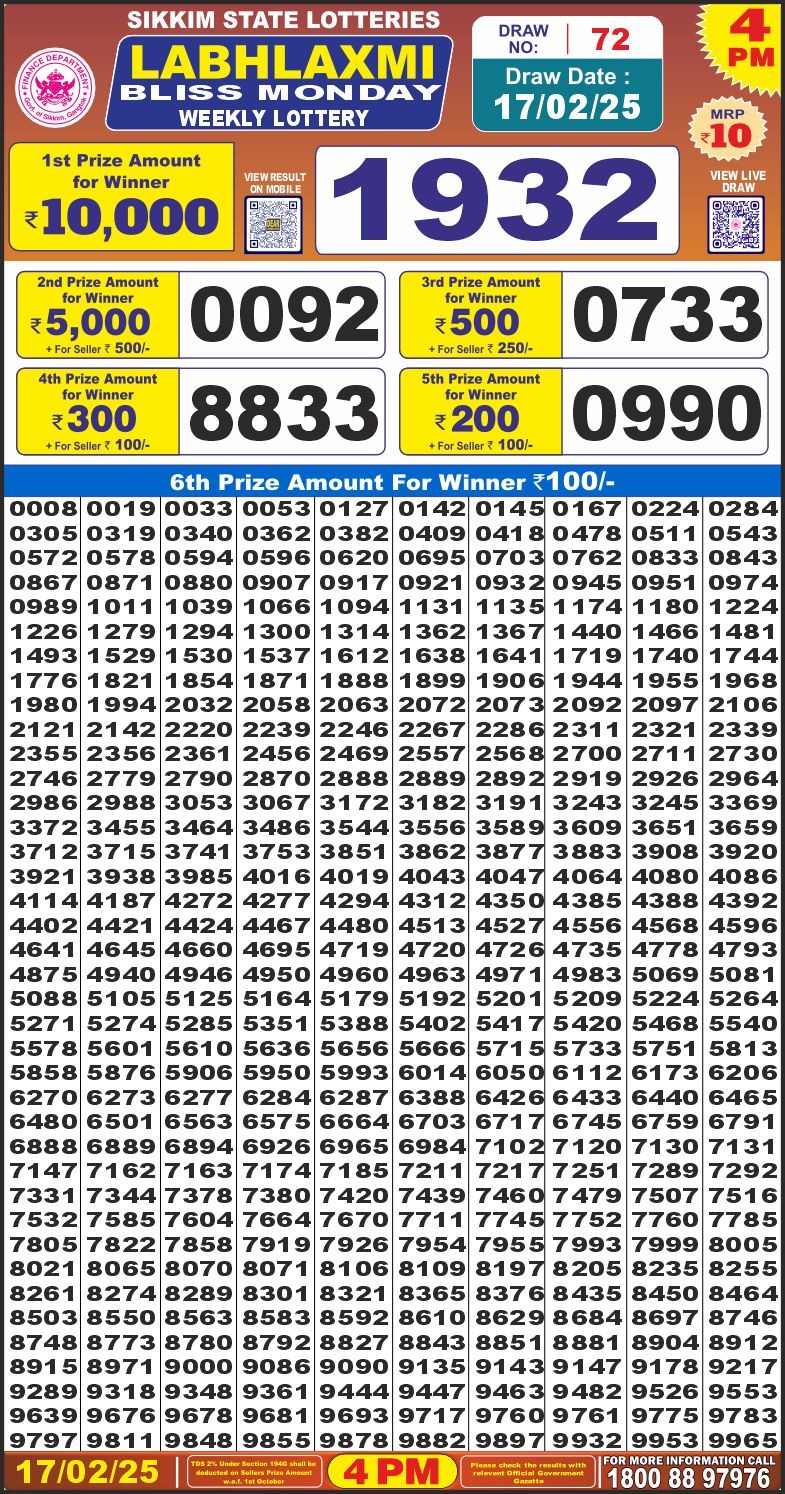 Labhlaxmi bliss monday weekly lottery 4 pm result 17-2-25