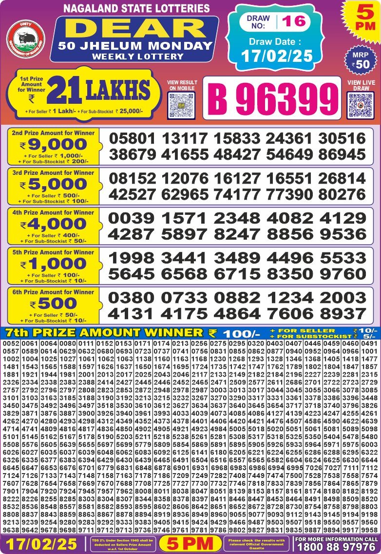 Dear 50 jhelum monday weekly lottery 5 pm result 17-2-25