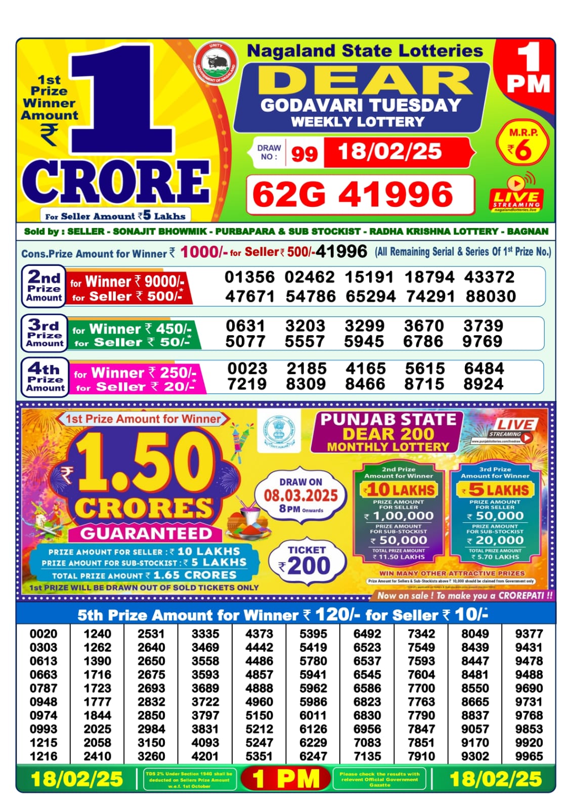 Punjab state dear 10 diamond weekly lottery 6 pm result 18-2-25