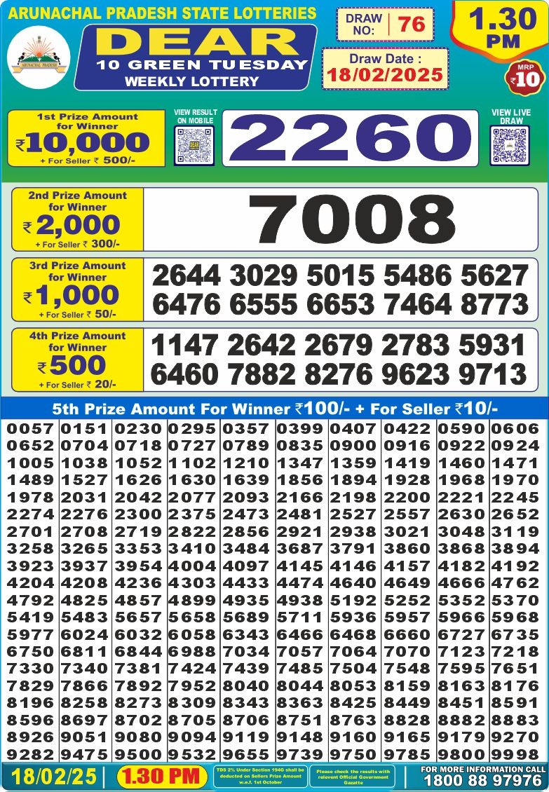 Dear 10 green tuesday weekly lottery 1:30 pm result 18-2-25