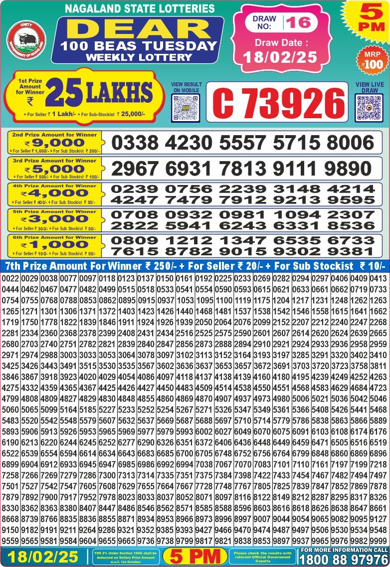 Dear 100 beas tuesday weekly lottery 5 pm result 18-2-25