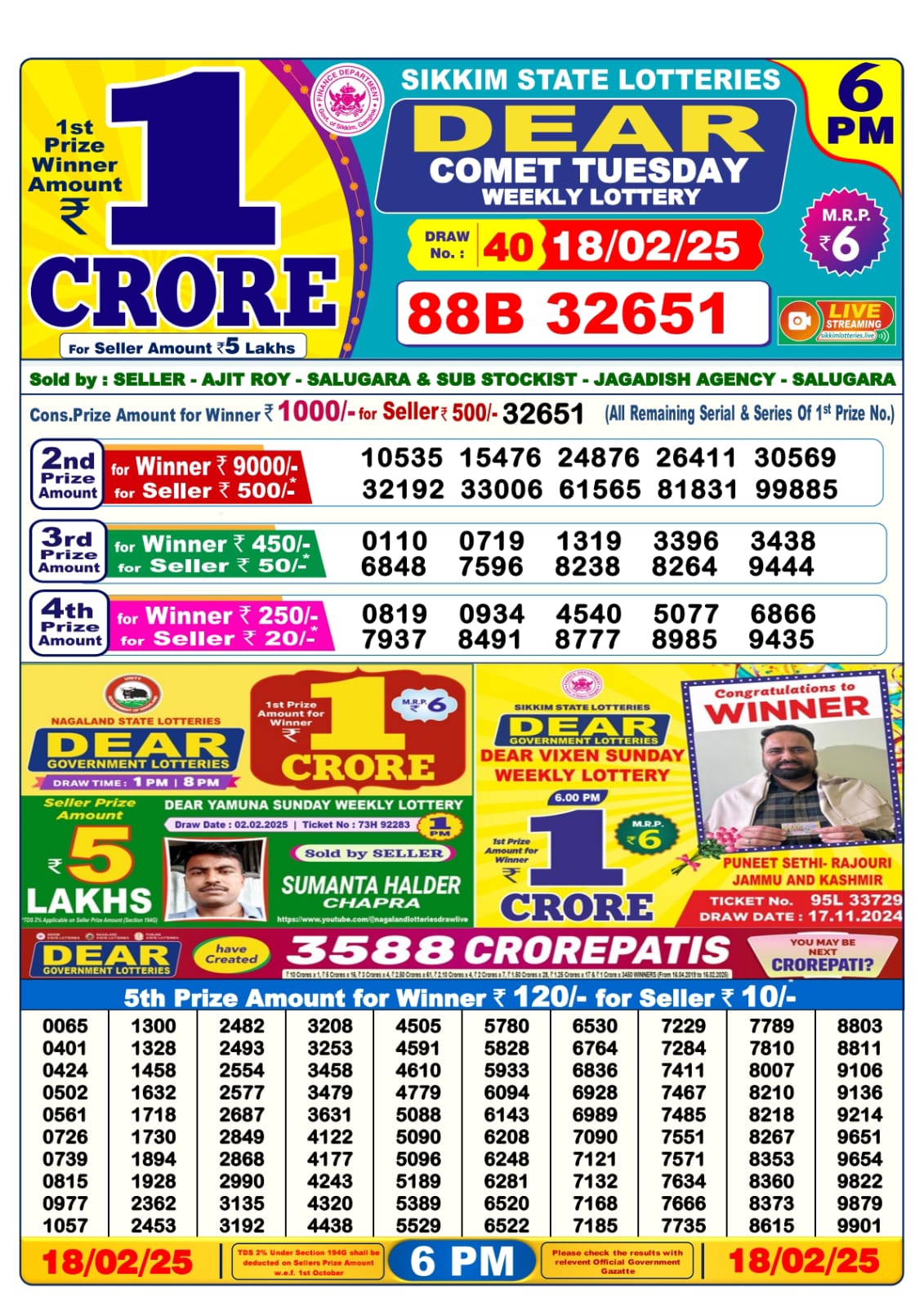 Dear coment tuesday weekly lottery 6 pm result 18-2-25
