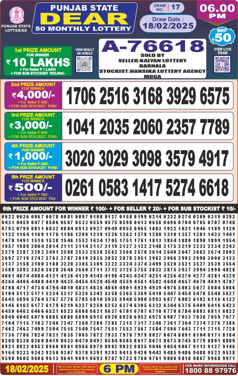 Punjab state dear 50 Monthly lottery result 6 pm 18-2-25