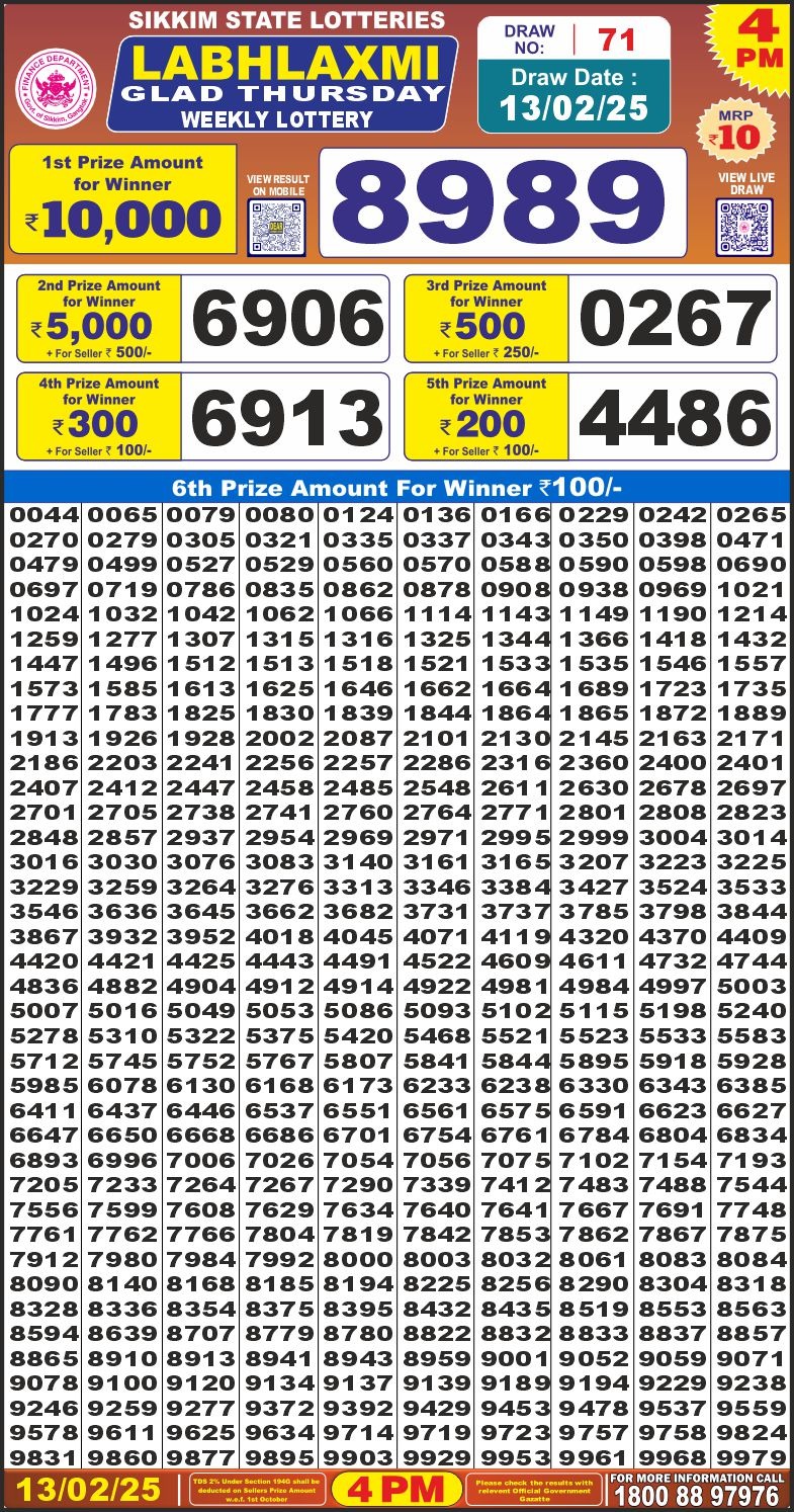 Labhlaxmi glad Thursday weekly lottery 4 pm result 13-2-25