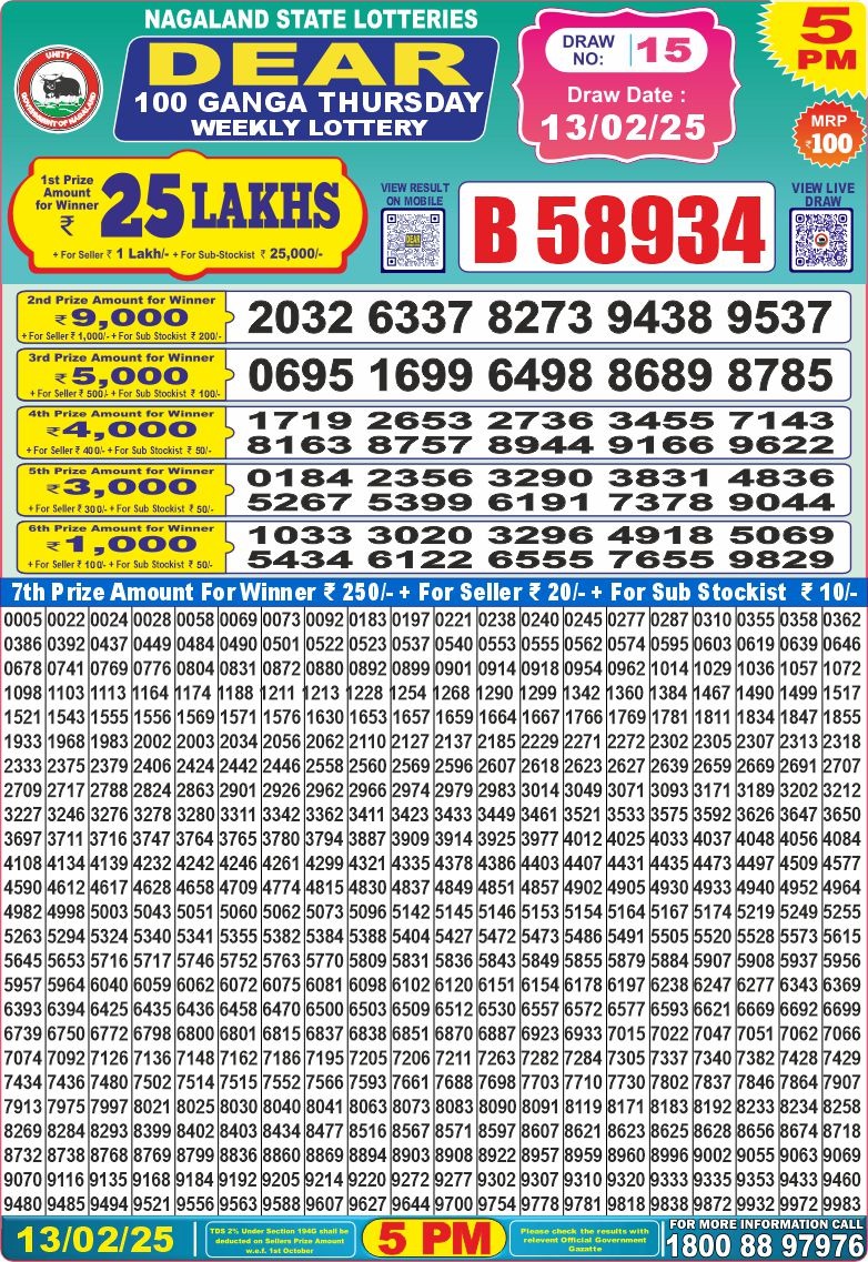 Dear 100 ganga Thursday weekly lottery 5 pm result 13-2-25