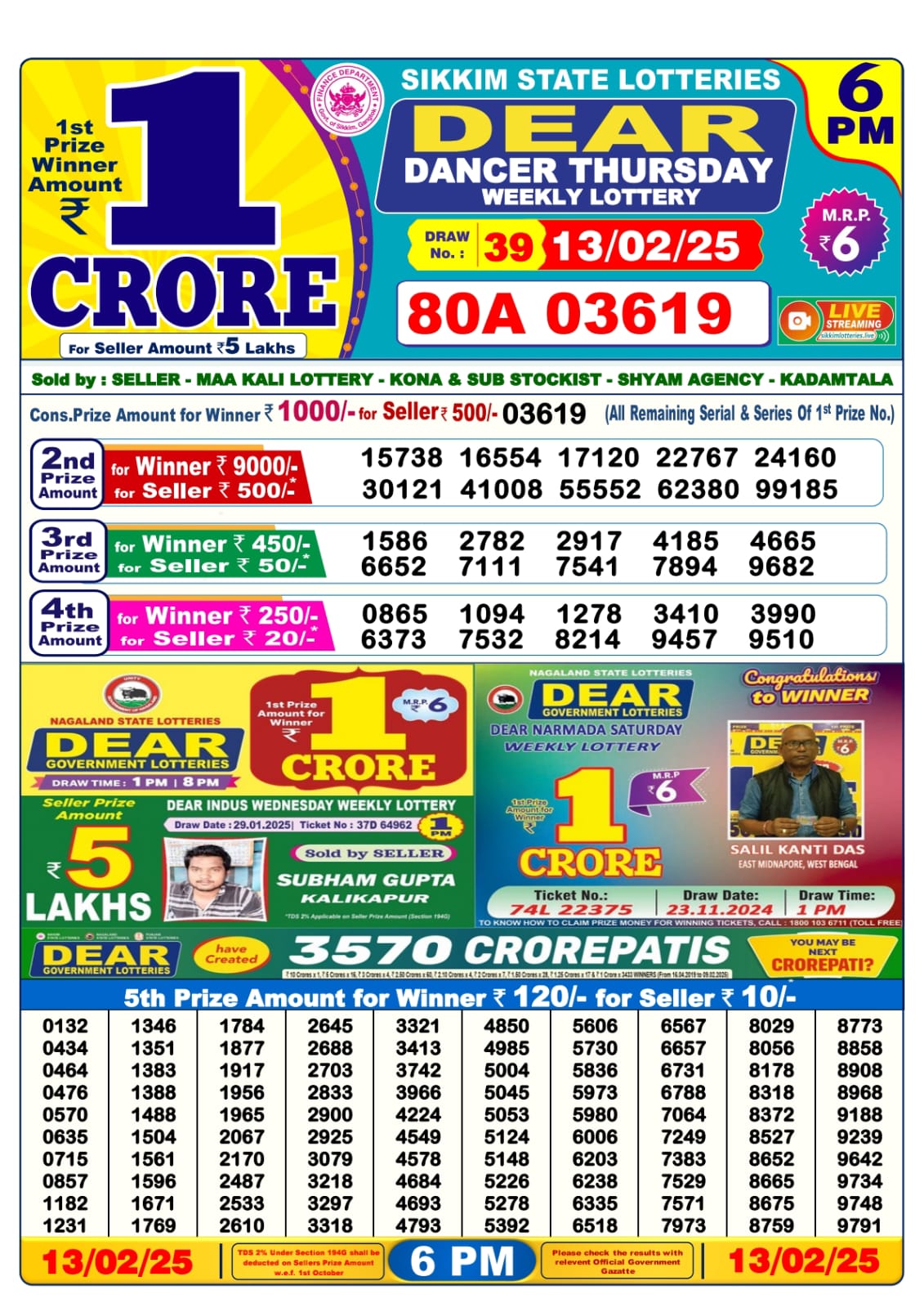 Dear dancer Thursday weekly lottery 6 pm result 13-2-25