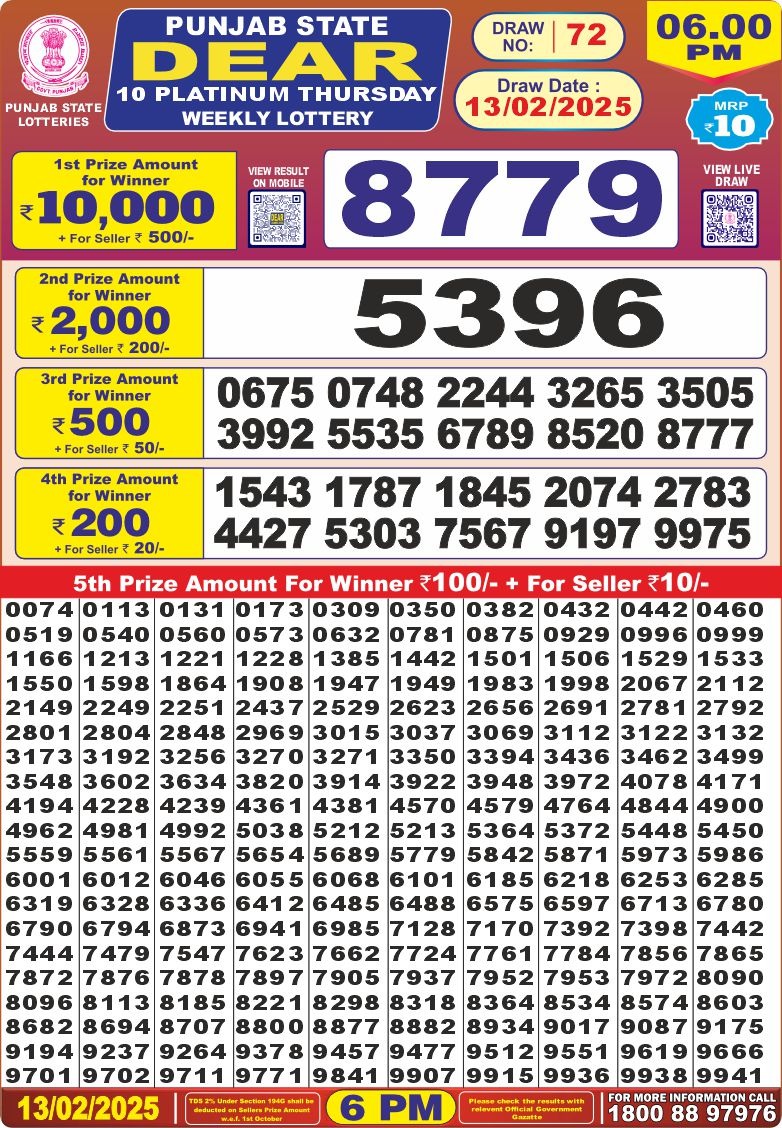 Punjab state dear 10 platinum Thursday weekly lottery 6 pm result 13-2-25