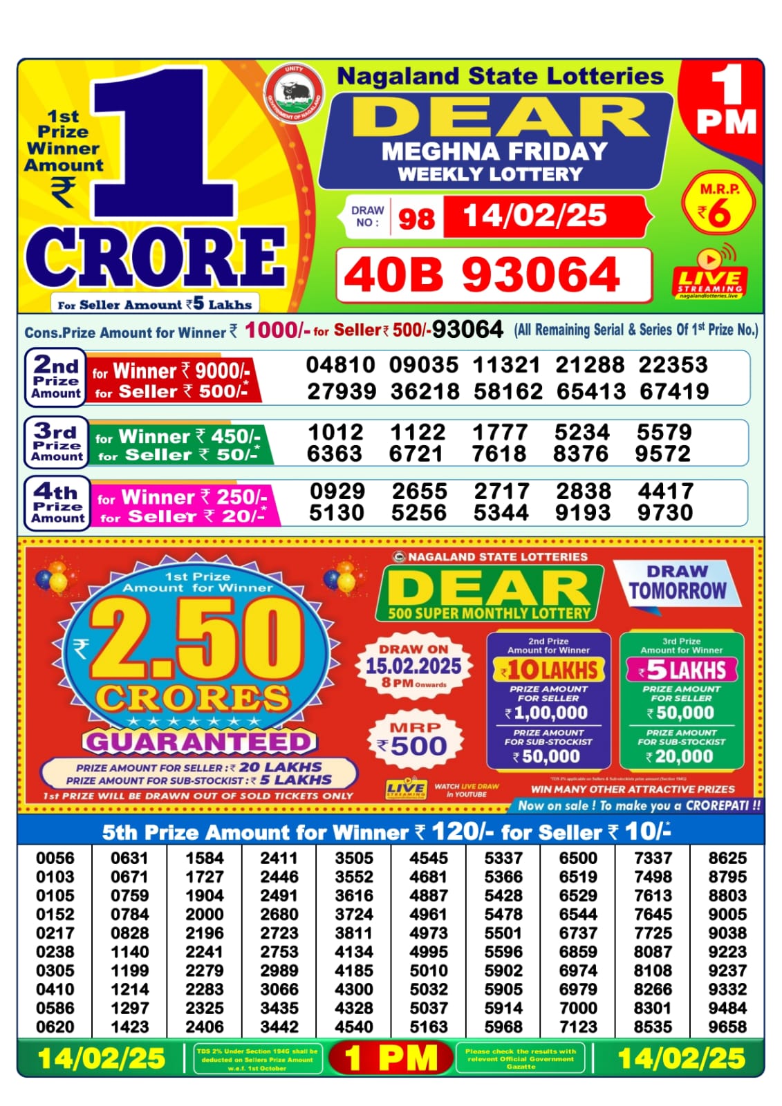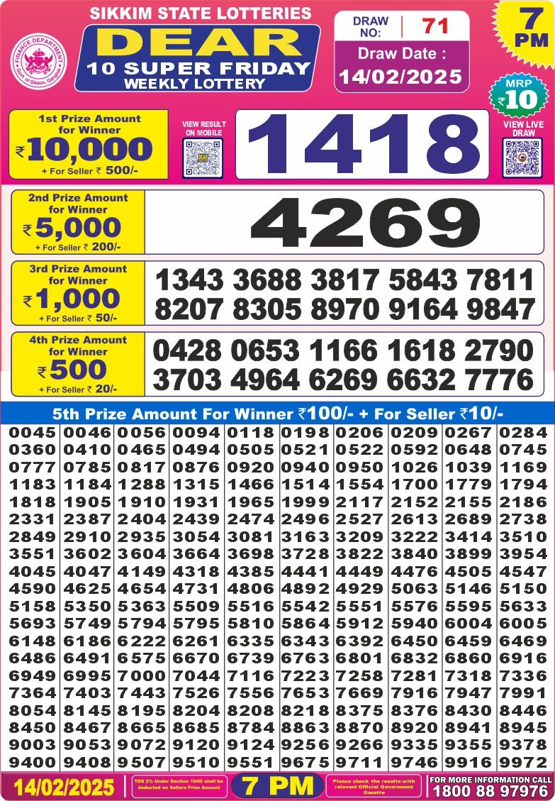 Dear 10 super friday weekly lottery 7 pm result 14-2-25