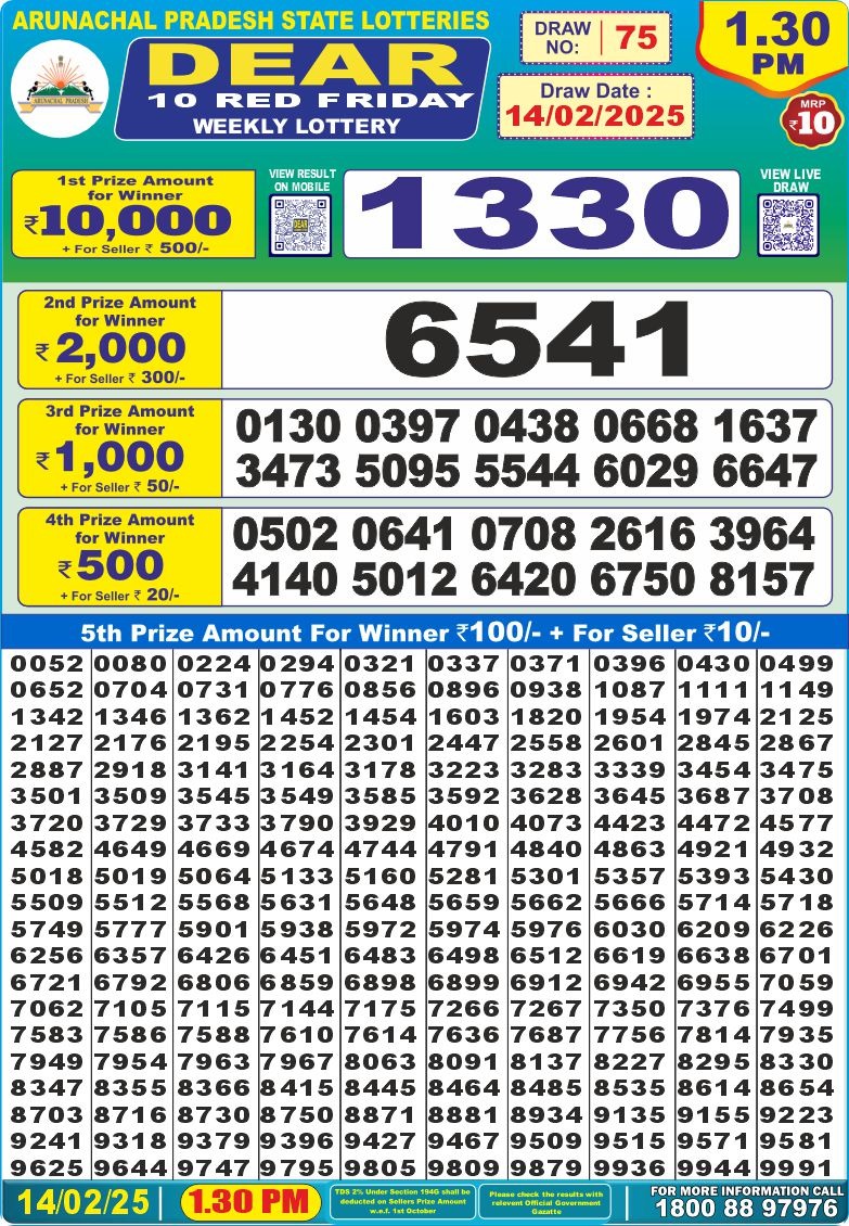 Dear 10 red friday weekly lottery 1:30 pm result 14-2-25