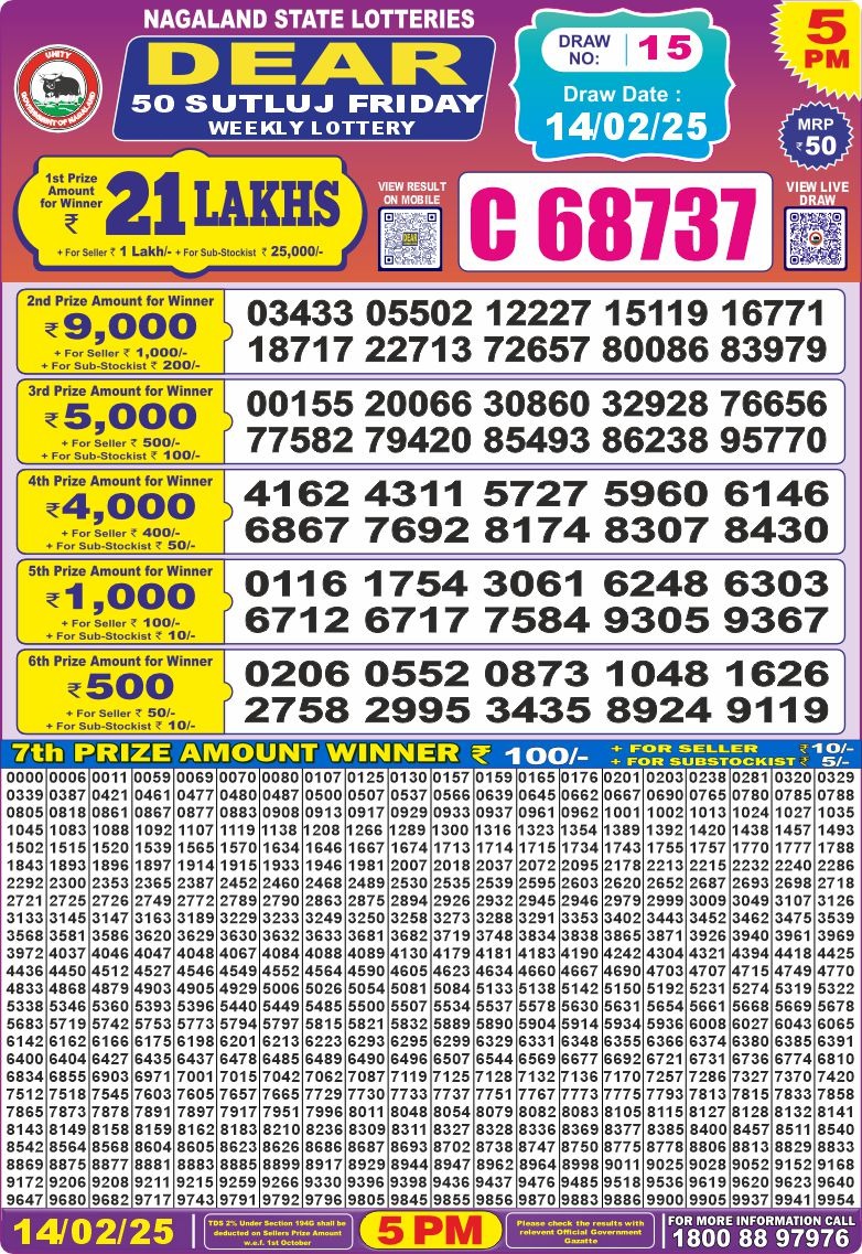 Dear 50 sutluj friday weekly lottery 5 pm result 14-2-25