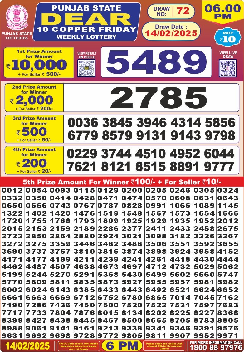 Punjab state dear 10 copper friday weekly lottery 6 pm result 14-2-25