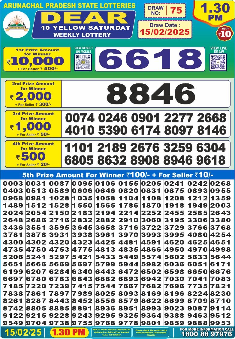Dear 10 Yellow Saturday weekly lottery 1:30 pm result 15-2-25
