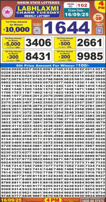 Labh Laxmi Charm Tuesday Weekly Lottery 4 PM Result 16-09-25