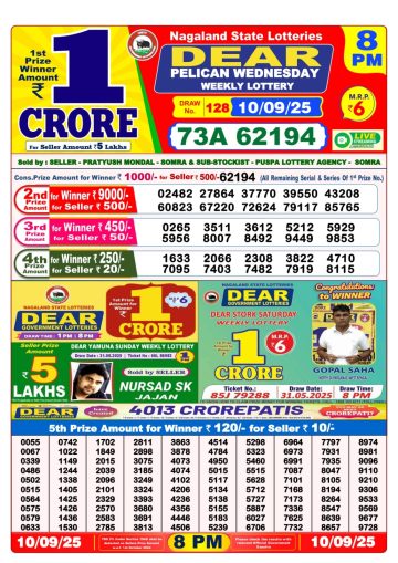 Dear Pelican Wednesday Weekly Lottery 8 PM Result 10-09-25