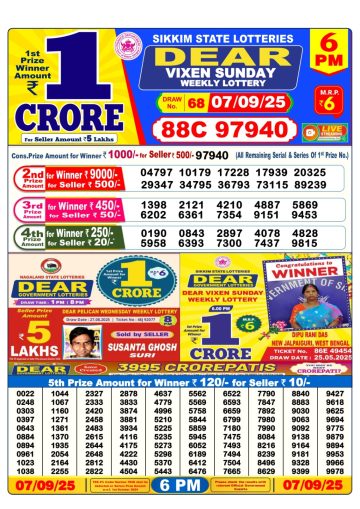 Dear Vixen Sunday Weekly Lottery 6 PM Result 07-09-25