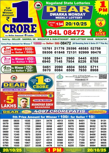 Dear Dwarka Monday Weekly Lottery 1 PM Result 20-10-25