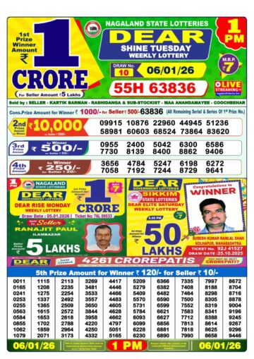 Dear Shine Tuesday Weekly Lottery 1pm Result 06-01-26