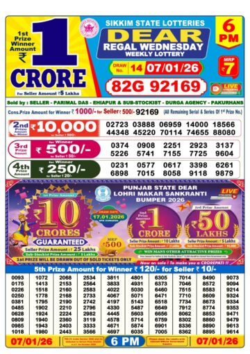 Dear Regal Wednesday Weekly Lottery 6pm Result 14-01-26