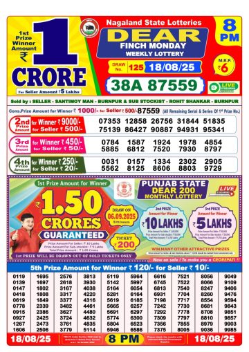 Dear Finch Monday Weekly Lottery 8 PM Result 18-08-25