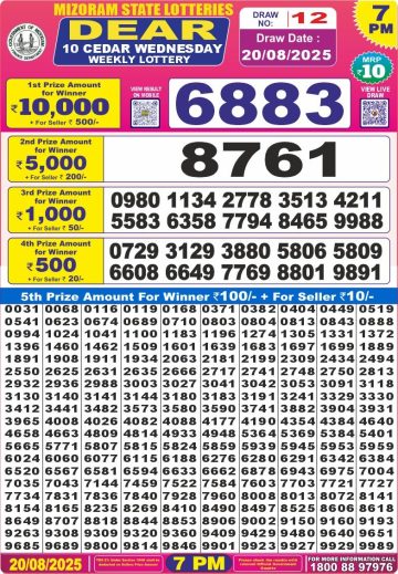 Dear 10 Cedar Wednesday Weekly Lottery 7 PM Result 20-08-25