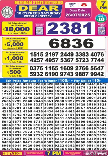 Dear 10 cypress saturday weekly lottery 7 pm result 26-7-25