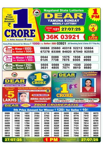 Dear Yamuna Sunday Weekly Lottery 1 PM Result 27-07-25