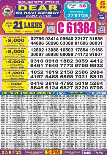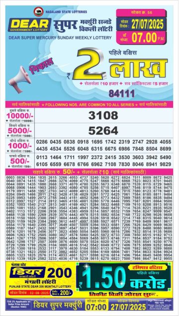 Dear Super Mercury Sunday Weekly Lottery 7 PM Result 27-07-25