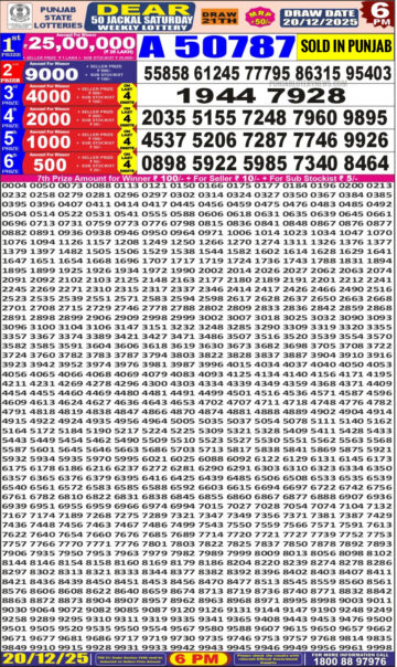 Punjab State Dear 50 Jackal Saturday Weekly Lottery 6pm Result 20-12-25