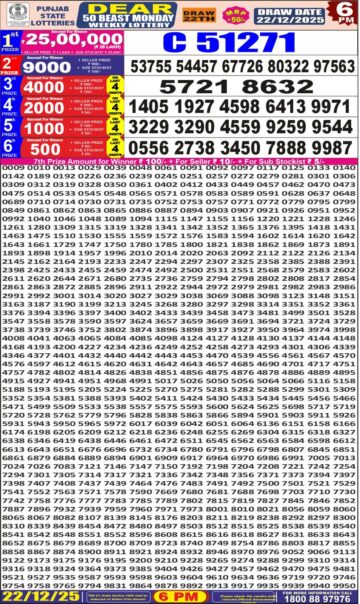 Punjab State Dear 50 Beast Monday Weekly Lottery 6pm Result 22-12-25