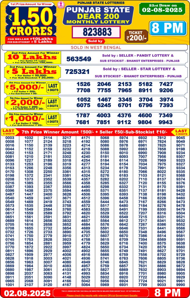 Punjab State 200 Monthly Lottery Result 8pm Out 02.08.25