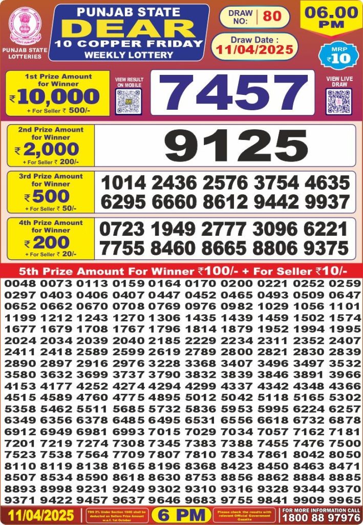 Punjab state dear 10 copper friday weekly lottery 6 pm result 11-4-25 Results Editorial Staff April 11, 2025 Leave a Comment on Punjab state dear 10 copper friday weekly lottery 6 pm result 11-4-25 Posted in Dear Lottery 6 PM Result Share: XFacebookPinterestRedditVKDiggLinkedinMix Dear Legend Monday Weekly Lottery Result Update 📅 Date: 11 April 2025 ⏰ Draw Time: 6:00 PM 🟢 Result Declared 🔗 View previous Dear Lottery 6 PM Result results Related Results Dear Legend Monday Weekly Lottery 6pm Result 02-03-26 Dear Empire Sunday Weekly Lottery 6pm Result 01-03-26 Dear Elite Saturday Weekly Lottery 6pm Result 28-02-26 Dear Crown Friday Weekly Lottery 6pm Result 27-02-26 Dear Supreme Thursday Weekly Lottery 6pm Result 26-02-26 Dear Regal Wednesday Weekly Lottery 6pm Result 25-02-26 Dear Prestige Tuesday Weekly Lottery 6pm Result 24-02-26 Author: Results Editorial Staff