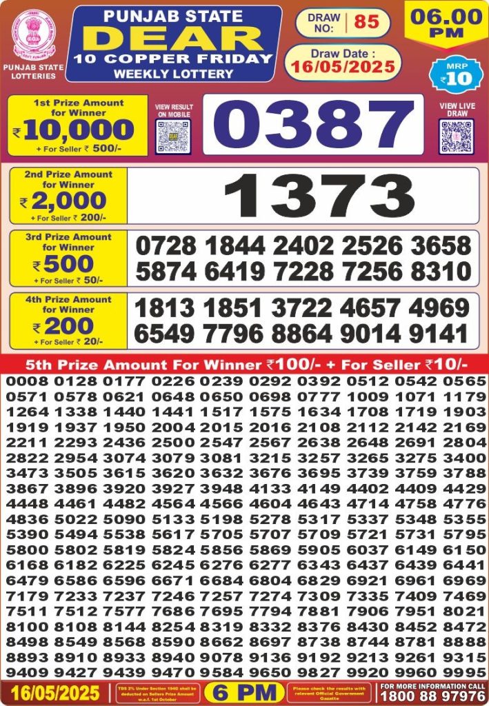 Punjab state dear 10 copper friday weekly lottery 6 pm result 16-5-25 Results Editorial Staff May 16, 2025 Leave a Comment on Punjab state dear 10 copper friday weekly lottery 6 pm result 16-5-25 Posted in Dear Lottery 6 PM Result Share: XFacebookPinterestRedditVKDiggLinkedinMix Dear Legend Monday Weekly Lottery Result Update 📅 Date: 16 May 2025 ⏰ Draw Time: 6:00 PM 🟢 Result Declared 🔗 View previous Dear Lottery 6 PM Result results Related Results Dear Legend Monday Weekly Lottery 6pm Result 02-03-26 Dear Empire Sunday Weekly Lottery 6pm Result 01-03-26 Dear Elite Saturday Weekly Lottery 6pm Result 28-02-26 Dear Crown Friday Weekly Lottery 6pm Result 27-02-26 Dear Supreme Thursday Weekly Lottery 6pm Result 26-02-26 Dear Regal Wednesday Weekly Lottery 6pm Result 25-02-26 Dear Prestige Tuesday Weekly Lottery 6pm Result 24-02-26 Author: Results Editorial Staff