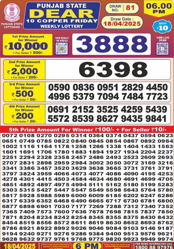 Punjab state dear 10 copper friday weekly lottery 6 pm result 18-4-25