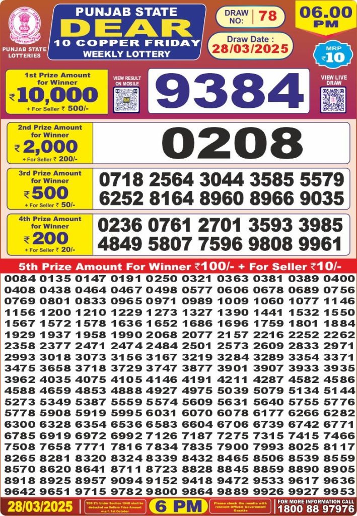 Punjab state dear 10 copper friday weekly lottery 6 pm result 28-3-25