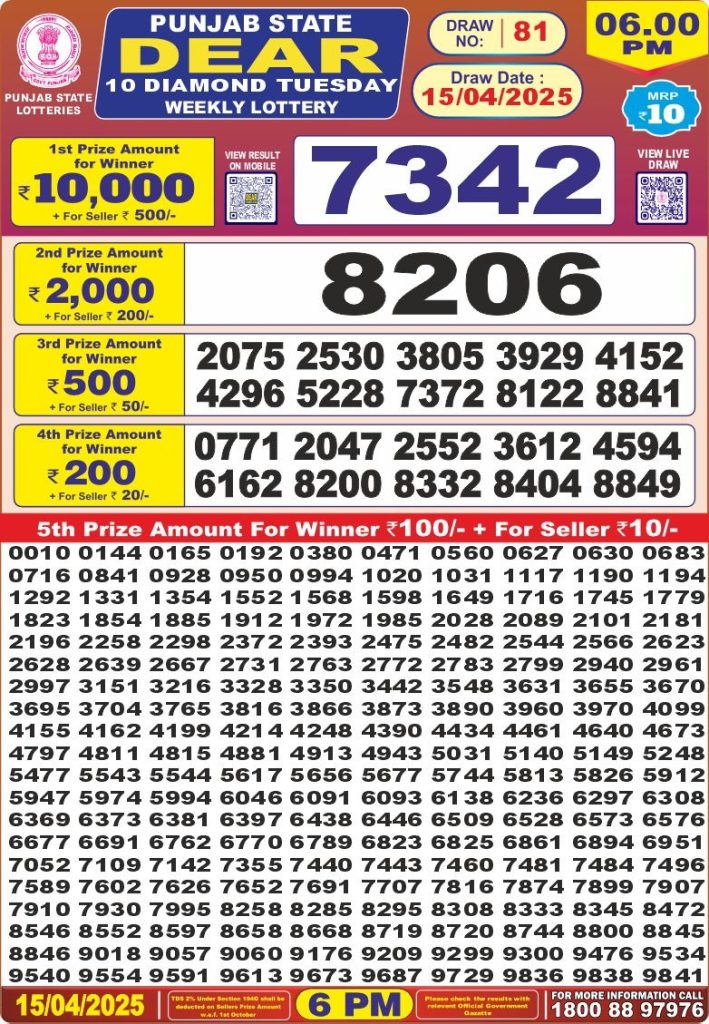 Punjab state dear 10 diamond 6 pm result 15-4-25