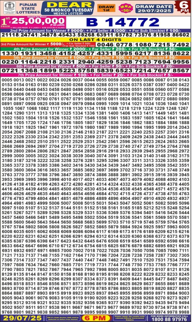 Punjab State Dear 50 Bronco 6 PM Result 29-07-25 wpailnadmin July 29, 2025 Leave a Comment on Punjab State Dear 50 Bronco 6 PM Result 29-07-25 Posted in Dear Lottery 6 PM Result Share: XFacebookPinterestRedditVKDiggLinkedinMix Dear Legend Monday Weekly Lottery Result Update 📅 Date: 29 July 2025 ⏰ Draw Time: 6:00 PM 🟢 Result Declared 🔗 View previous Dear Lottery 6 PM Result results Related Results Dear Legend Monday Weekly Lottery 6pm Result 02-03-26 Dear Empire Sunday Weekly Lottery 6pm Result 01-03-26 Dear Elite Saturday Weekly Lottery 6pm Result 28-02-26 Dear Crown Friday Weekly Lottery 6pm Result 27-02-26 Dear Supreme Thursday Weekly Lottery 6pm Result 26-02-26 Dear Regal Wednesday Weekly Lottery 6pm Result 25-02-26 Dear Prestige Tuesday Weekly Lottery 6pm Result 24-02-26 Author: wpailnadmin Website