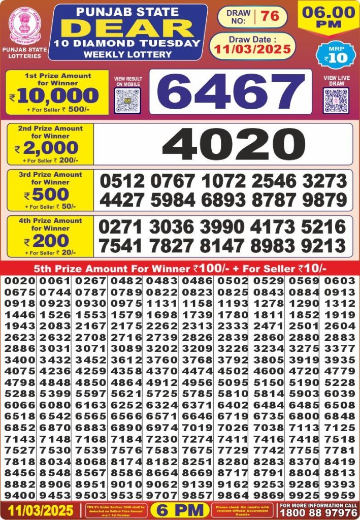 Punjab state dear 10 diamond 6 pm result 11-3-25 site editor March 11, 2025 Leave a Comment on Punjab state dear 10 diamond 6 pm result 11-3-25 Posted in Results Share: XFacebookPinterestRedditVKDiggLinkedinMix Related Results Punjab State Dear 200 Monthly Lottery 6pm Result 07-02-26 Punjab State Lohri Bumper Lottery Result 2026 Live Updates Dear X-Mas Bumper 6pm Lottery Result 27-12-25 Punjab State Dear 100 Monthly Lottery 7pm Result 09-12-25 Punjab State Lottery Dear 100 Monthly 7pm Result 11-11-2025 Dear 2000 Monthly Lottery 7pm Result 08-11-25 Check Now Dear Puja Bumper Lottery Result 11-10-25 Publish Author: site editor