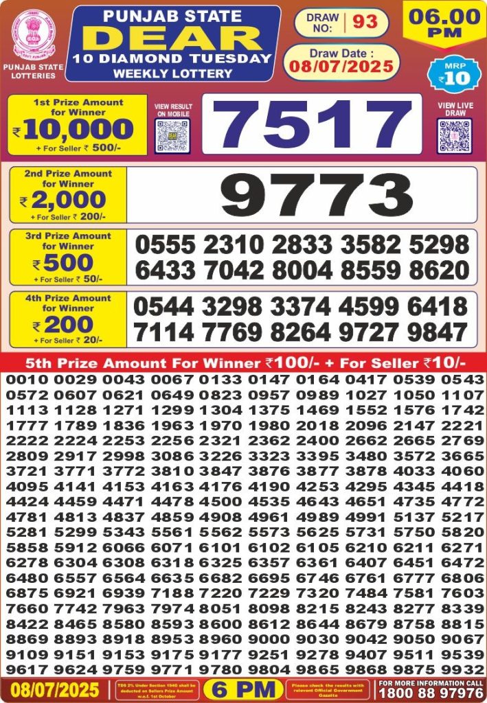 Punjab state dear 10 diamond 6 pm result 8-7-25 Results Editorial Staff July 8, 2025 Leave a Comment on Punjab state dear 10 diamond 6 pm result 8-7-25 Posted in Dear Lottery 6 PM Result Share: XFacebookPinterestRedditVKDiggLinkedinMix Dear Legend Monday Weekly Lottery Result Update 📅 Date: 08 July 2025 ⏰ Draw Time: 6:00 PM 🟢 Result Declared 🔗 View previous Dear Lottery 6 PM Result results Related Results Dear Legend Monday Weekly Lottery 6pm Result 02-03-26 Dear Empire Sunday Weekly Lottery 6pm Result 01-03-26 Dear Elite Saturday Weekly Lottery 6pm Result 28-02-26 Dear Crown Friday Weekly Lottery 6pm Result 27-02-26 Dear Supreme Thursday Weekly Lottery 6pm Result 26-02-26 Dear Regal Wednesday Weekly Lottery 6pm Result 25-02-26 Dear Prestige Tuesday Weekly Lottery 6pm Result 24-02-26 Author: Results Editorial Staff